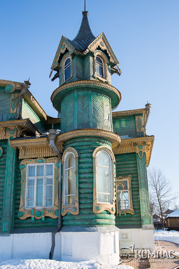 В свою очередь, "бочка" украшена характерным для русского деревянного зодчества свесом-перекрестием и выпусками "полотенец" с прорезными крестиками с точками - славянским символом засеянного поля, символом плодородия. Этот орнамент многократно повторяется во всем деревянном декоре главного дома усадьбы Морозова. Если от дома Морозовых перейдете на противоположную сторону дороги и пройдете сотню метров в сторону цента, то увидите еще один замечательный образец гороховецкой деревянной архитектуры. Дом председателя земской управы Пришлецова или "дом с русалками", 1915 г. (Ленина, 38)