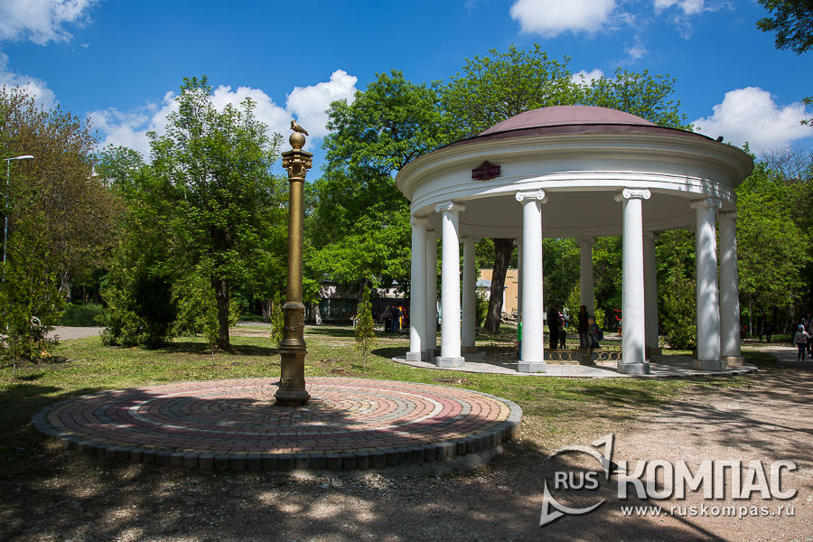 Свернем от фонтана налево, чтобы взглянуть поближе на зарешеченную каменную арку, на деле оказавшейся бюветом №2 ныне оскудевшего источника минеральной воды Ессентуки №18. Сейчас в Ессентуках в употреблении остались только воды источников №4 и №17. Однако первый исследователь местных минеральных вод московский врач Фёдор Петрович Гааз нашел, разделил по химическому составу и пронумеровал 23 источника, часть из которых к нашему времени иссякла, а часть не применяют для лечения. Через год после поездки в своей книге "Мое путешествие на Александровские воды в 1809 и 1810" Гааз с восторгом отзывался о свойствах местной воды, но курортом станица Ессентуковская тогда так и не стала. Чуть дальше мы увидели еще один бювет с недействующим источником №18, а над ним, на верхней террасе, куда легко подняться по боковым каменным лестницам - Музыкальную беседку, установленную 1879 году. В те годы в утренние и вечерние часы, когда курсовые собирались у источников, на полукруглой площадке вблизи главного курортного источника №17 играл военный оркестр.
