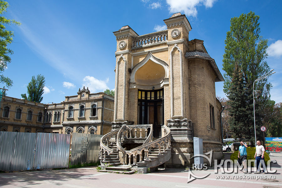 На месте нынешнего строения когда-то были ямы, в которых принимали лечебные ванны местные жители, а позднее и курортники. Со временем у нарзанного источника стали строить крытые кибитки с подогреваемой водой. И наконец, в 1849 году началось строительство каменного здания по проекту архитектора Уптона в романтическом стиле английской готики, которая так нравилась тогдашнему наместнику Северного Кавказа князю Михаилу Семеновичу Воронцову. Для сравнения взгляните на сказочный Воронцовский дворец - летнюю резиденцию князя в Алупке. Параллельно бульвару течет маловодная река Березовая (местные карачаевцы называли её Элькуш, что означает "пристанище орла"). Судя по установленному в начале Курортного бульвара футштоку, река эта с характером. В 2002 году уровень воды в ней настолько поднялся, что бульвар оказался полностью затоплен. Через город протекает еще одна река с непростым характером - приток Березовой Ольховка (другое название Пхазады), но о ней мы поговорим чуть позже, когда пойдем в парк. Вдоль бульвара благополучно сохранились дореволюционные гостиницы, виллы купцов и генералов. О каждом из зданий есть что рассказать. Вот, к примеру, курортная поликлиника (Курортный бульвар, 15). До 1930 года здесь была гостиница "Россия", построенная на деньги владикавказских потомственных почетных граждан и крупных землевладельцев братьев Николая и Владимира Зипаловых. В 1902 году гостиница состояла из двух корпусов - зимнего и летнего. В летнем корпусе сейчас разместились магазины.