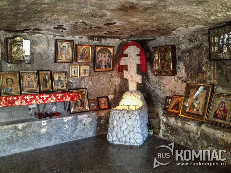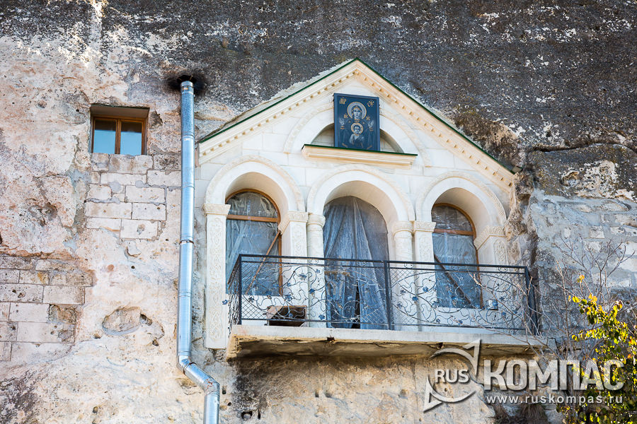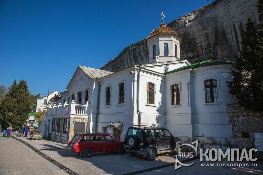 Алтарь храма вырублен прямо в скале, к нему пристроена остальная часть церкви. Первоначально храм украшал иконостас из стеклянной мозаики, который не сохранился. Строительство храма завершилось в 1895 году. После революции богослужения здесь прекратились, и в помещении расположилась пекарня. Во время Великой Отечественной войны здание было разрушено до основания, поэтому нынешний храм - это восстановленная копия предшественника. Но все перечисленные наземные строения появились у Монастырской скалы в XIX веке, т.е. значительно позже вырубленных в ней пещерных храмов. Чтобы увидеть пещерные храмы, мы проходим через ворота, украшенные маковкой с крестом, и попадаем на монастырский дворик, огороженный высоким забором.