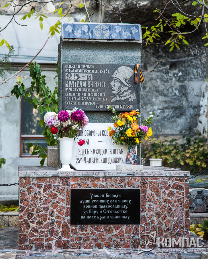 В центре двора установлен памятник воинам 25-й Чапаевской дивизии. В июне 1942 года на Инкерманских высотах шли бои за Севастополь. Бойцы держали оборону до последнего. Официально дивизия была расформировали 30 июля 1942 года, а её знамёна были утоплены в Чёрном море. Видно, что за памятником ухаживают.