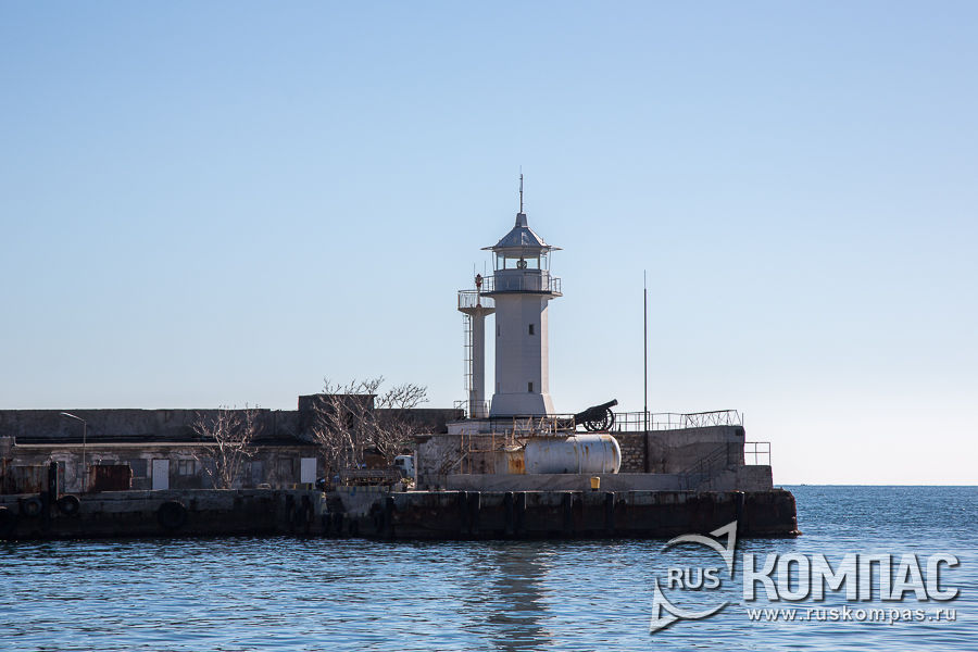 Погрузив на борт туристов, катер отчалил от берега и медленно проплыл мимо находящегося рядом с пассажирским портом Ялтинского маяка. У подножия маяка, как и столетие назад, стоит старинная пушка. Нынешний маяк, построенный на самом краю бетонного мола - это восстановлена реплика маяка 1874 года на мысе Иоанна, практически полностью разрушенного в годы Великой Отечественной войны.