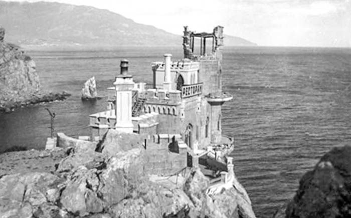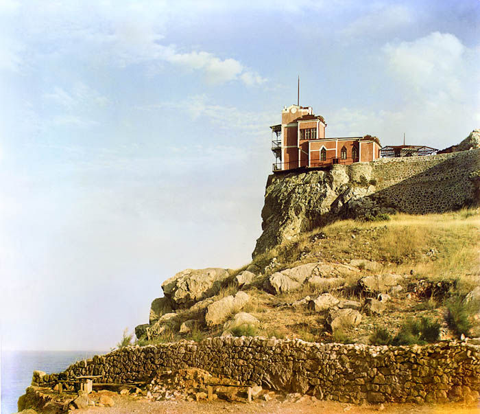 Свои нынешние очертания "Ласточкино гнездо" приобрело относительно недавно, хотя первые строения на площадке Аврориной горы появились еще в конце XVIII века, после присоединения Крыма к России. Первым выстроил свой деревянный "Замок любви" генерал, участник русско-турецкой войны, о котором больше ничего не известно. Наследники генерала продали дачу Альберту Тобину - придворному врачу Ливадийского двоца. При нем деревянный дом на скале получил название "Ласточкино гнездо". Следующей владелицей дачи стала московская купчиха Анна Рахманова, перестроившая деревянную дачу, заменив её каменным домом. И наконец, "Ласточкино гнездо" переходит в руки крупного немецкого нефтепромышленника барона фон Штенгеля. Именно он пожелал придать дому на Аврориной горе черты готического замка. Ласточкино гнездо на фотографии Прокудина-Горского, 1905 г.