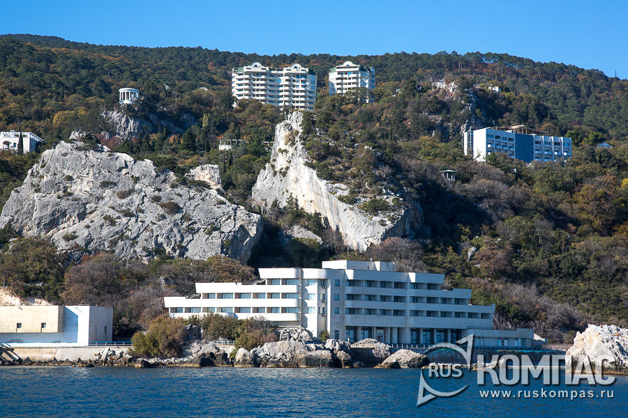 Смелый проект архитекторов Василевского, Стефанчука и конструктора Канчели был продиктован сложностью природных условия участка, выбранного под строительство международного санатория для советских и чешских трудящихся: крутой склон горы, сейсмичность в 9 баллов, разлом земной коры и наличием оползня. Для меня загадка, почему выбрали именно эту местность? Однако результат впечатляет. Присмотритесь к основанию здания: оно парит в воздухе, потому что вся нагрузка от него сосредоточена и передается скале через три башенные опоры. Рассказывают, что когда возвели опорные башни, их заметили на противоположном берегу. И турки приняли появившиеся над побережьем опоры за строящийся ракетодром! Даже пришлось давать официальный ответ морским соседям. Гостиничные номера расположили по периметру кольца диаметром 76 метров, и все они выходят окнами на море. Внутри здания много света из-за использования стекла и металлоконструкций, которые были возведены при участии чешских строителей из чешских же материалов. Даже отопление и горячее водоснабжение в санатории необычное - для подогрева воды используется тепловая энергия моря. И вот впереди показался мыс Ай-Тодор. Название мыса дано по находившемуся здесь древнеримскому монастырю Теодора Тирна. Мыс состоит из трёх скалистых отрогов - левого (восточного) Лимен-Буруна (греческого "Мыс гавани"), среднего Монастыр-Буруна, где находится Аврорина скала с замком "Ласточкино гнездо", и западного Ай-Тодорского отрога с руинами крепости Харакс, маяком и имением великого князя Михаила Николаевича Романова, брата императора Александра II. Сначала проплываем мимо мыса Лимен-Бурун, на вершине которого построена обзорная площадка, а чуть ниже установлена скульптура орла. У подножия Лимен-Буруна видная живописно торчащая из воды одинокая скала Парус. До землетрясения 1927 года Парус соединялся с мысом Лимен-Бурун каменным перешейком, который не выдержал земных толчков и обрушился в море.