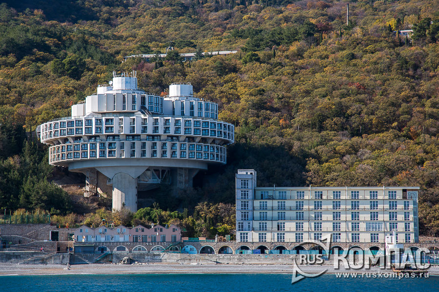 Проект дворца в мавританском стиле разработали в фирме братьев Тарасовых, один из которых Николай Георгиевич Тарасов с 1900 являлся бессменным ялтинским городским архитектором в течение двенадцати лет. Эта дача стала последним приобретением семьи Романовых в Крыму. После времена сильно изменились, о чем мы уже рассказывали в посте про Ливадию. Кстати, в отличие от Ливадии, спуск к морю от дачи Дмитрия Константиновича появился только в 1986 году, когда в скалах прорубили лестницу, ведущую к побережью, вдоль которой установили беседки и гроты. Сейчас на даче отдыхают курортники и действует музей "Резиденция Князя Романова". Проплывая мимо, невозможно не заметить на Ялтинском берегу потрясающую "летающую тарелку" санатория "Дружба" - великолепный образец советского строительства 1985 года, вошедшего в антологию Европейской архитектуры конца ХХ века.