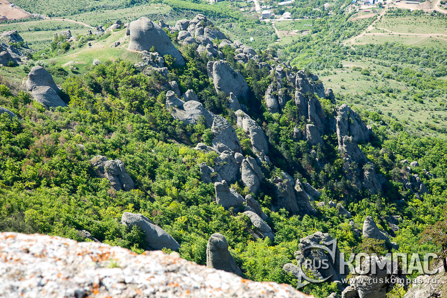 От скалы Аленга, обходя столбы Чомачай, мы спускаемся по тропинке в сторону моря. С этой высоты все еще хорошо просматривается Алуштинская долина и прибрежная полоса.