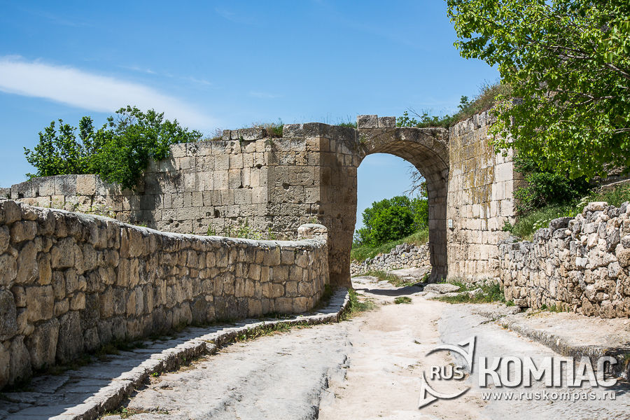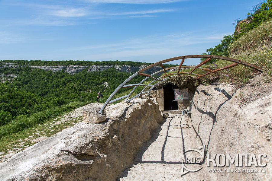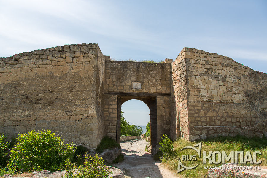 От ворот ведет узкий коридор, вырубленный в скале, над которым был деревянный настил, откуда на головы нападавших защитники крепости сбрасывали камни, лили кипяток и горячее масло.