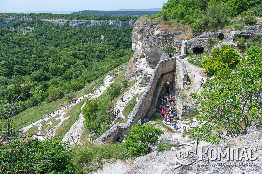 Тропа выводит нас к Средней оборонительной стене с воротами (Орта-Капу), пересекающей плато от одного края обрыва до другого и разделяющий Чуфут-Кале на Старый и Новый город. С VI-VII веков и вплоть до возведения караимами Восточной оборонительной стены в XIV-XV веках, она защищала город от набегов.