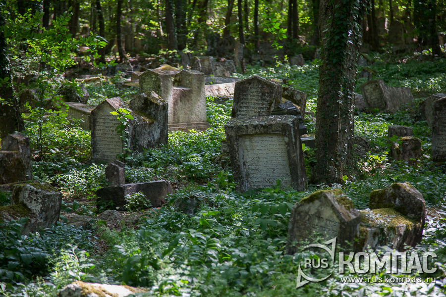 С внешней стороны над воротами вделана мраморная плита с изображениями рогатины и щита - знаки рода, своего рода герб или тамга, принятые у тюркских народов. От Восточных ворот тропинка ведет в Иосафатову долину - старое караимское кладбище, В прошлом здесь росли дубы, считавшиеся священными, рубить которые было запрещено. Само кладбище имело местное название Балта-тиймез - "топор не касается".