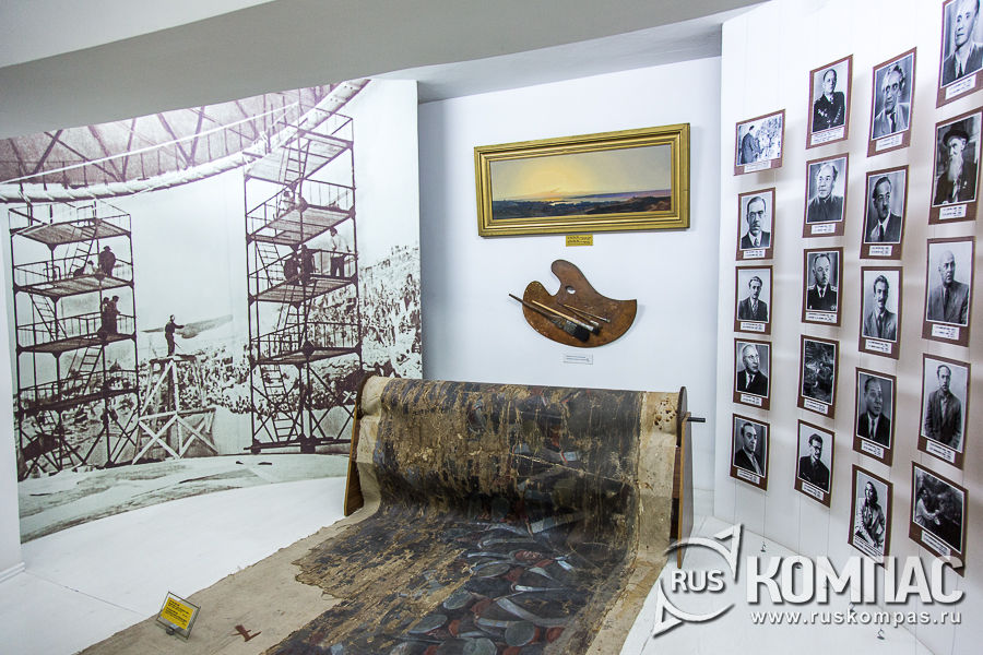 После войны было принято решение восстановить панораму, но картину воспроизвести уже на новом холсте. Холст соткали в Ленинграде, и 19 советских художников под руководством академика живописи Василия Николаевича Яковлева и профессора Павла Петровича Соколова-Скаля, буквально по кусочкам собрали панораму на основе сохранившихся фрагментов, фотографий и этюдов Франца Рубо. Слева на фото показан рабочий момент: художники, взобравшись на эшафодажи, писали заново огромную картину.