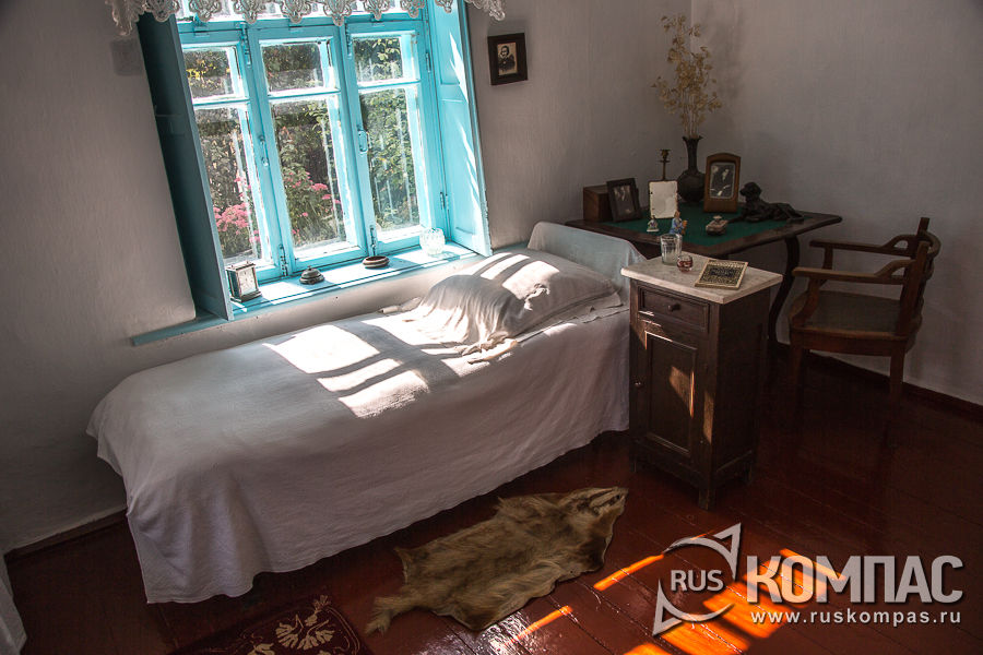 Сад занимал площадь более 13 соток, был запущен и не ухожен, но, по словам Грина, "в этой запущенности и есть покой". Опираясь на руку Нины Николаевны, он иногда гулял в саду. Встретив на своем пути раскидистый грецкий орех, решает, что "здесь как в беседке допишу наконец свою "Недотрогу". В комнате воспроизведена та же обстановка, что и была при жизни писателя. Здесь даже стоит старая сахарница с отколотым горлышком, которую в доме использовали как вазу. Когда-то Нина Николаевна ставила в неё розы, срезанные в саду. Грин трепетно относился ко всем цветам, но к розам с особой любовью. Говори, что каждый бутон в букете должен дожить свою жизнь до конца. Он мог, взяв цветок в руки, долго его рассматривать, а потом рассказать, какой женский образ мог бы из него получиться, подробно описать какой внешностью и каким характером обладала бы эта дама, как будто он с ней был действительно знаком. Рядом с сахарницей - английский звонок, в который звонил Грин, чтобы позвать Нину Николаевну. На окне - часы, про которые Грин говорил: "Не люблю я здесь одну вещь. Они не возвращает прожитых мгновений". И Нина Николаевна отвернула от Грина циферблат, чтобы он не смущал писателя. На полу у кровати лежит барсучья шкура. На стене висит небольшой портрет Эдгара По, вырезанный из журнала еще в юности. В личной библиотеке Грина хранилось одно из первых изданий По, купленных в Феодосии. На ломберном столике в изголовье кровати стоят фотографии Нины Николаевны и самого Александра Степановича, фарфоровая фигурка китайского божка и собака чугунного каслинского литья, которую он назвал пёс Трезор. Собаку он просил повернуть к нему мордой, чтобы иметь возможность встретиться с ней взглядом, когда вычитывал рукописи на кровати. Грин считал, что собака на него похожа, и свои послания супруге он так же подписывал - "Пёс Трезор".