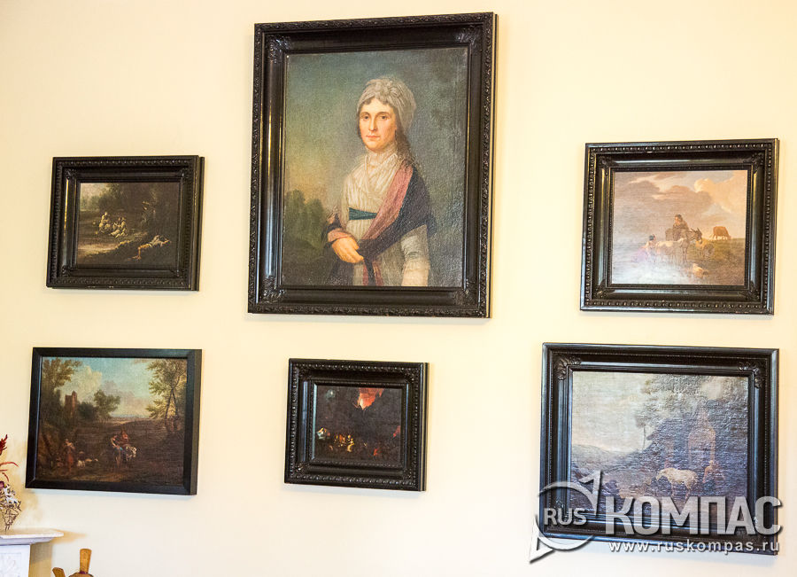 Напротив комнаты Зизи - зала, где воссоздана обстановка тригорской библиотеки, которую начал собирать еще дед хозяйки усадьбы Максим Дмитриевич Вындомский. В ней насчитывалось свыше 3-х тысяч экземпляров книг, но сохранилось только 350 книг, которые в настоящее время хранятся в Пушкинском доме. Александр Сергеевич находил в этой библиотеке материалы для написания исторического романа "Арап Петра Великого". В 1866 году, побывавший в Тригорском историк Михаил Иванович Семевский так описывал усадебную библиотеку: "Книги хранились в небольших старинных шкафчиках за стеклянными дверцами. Новых книг немного, но среди них есть редкие библиографические редкости, издания русских авторов, Сумарокова, Лукина, ежемесячные сочинения Миллера, творение Голикова "Деяния Петра Великого". Помимо книг по истории, в библиотеке были книги на французском, немецком, английском, испанском языках разных тематик, т.к. и тригорские барышни, и сама хозяйка дома свободно владели иностранными языками. К примеру, Прасковья Александровна выучила и английский, присутствуя на уроках собственных детей, для которых была выписана гувернантка из Англии. Здесь же были справочники, учебники, журналы, и, конечно, романы. Одним из таких романов "увлекся" и Пушкин - это книга английского писателя Сэмюэла Ричардсона "Кларисса Харлоу". Воспользовавшись экземпляром из тригорской библиотеки, он оставил на полях рисунок и написал в письме к брату Льву: "Читаю Кларису, мочи нет какая скучная дура!" Переходим в следующую комнату - гостиную, в которой воссоздана обстановка, опираясь на воспоминания современников Пушкина и на фото 1910 года. Стены гостиной украшают картины и гравюры. Одна из них "Искушение св. Антония", навеяла на поэта образы, которые он описал в романе "Евгений Онегин" (сон Татьяны): Один в рогах с собачьей мордой, Другой с петушьей головой, Здесь ведьма с козьей бородой.