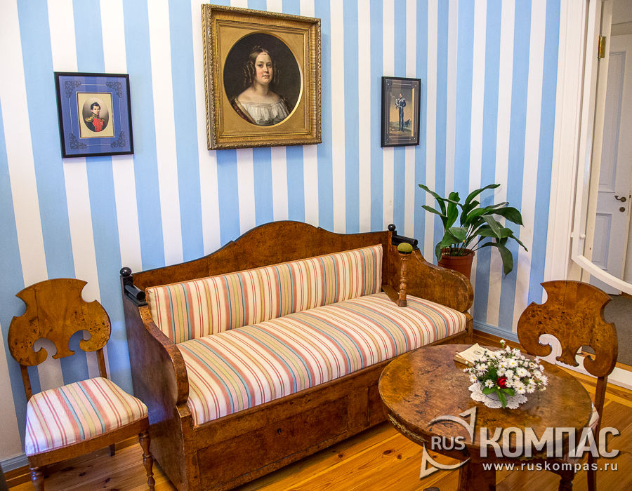 Подобные комнаты занимали барышни 13-18 лет, где они проводили время за рукоделием и чтением книг. На диване лежит грибок для шитья, в углу - столик-бобик для рукоделья, а у окна огромные пяльцы, на которых вышит заветный вензель А.П. - кумира тригорской молодежи. Пушкин, приходя в Тригорское, часто заставал барышень за вышиванием: Когда за пяльцами прилежно Сидите вы, склонясь небрежно, Глаза и кудри опустя, - Я в умиленьи, молча, нежно Любуюсь вами, как дитя. Юная Евпраксия, находясь среди гостей Тригорского, была объектом всеобщего внимания и нередко позволяла себе дерзкие выходки по отношению к друзьям брата. Листки со стихами, которые посвящали ей Пушкин и Языков, она могла тут же уничтожить на глазах авторов. В небольшом четверостишие "К Зине" Пушкин полушутливо отметил это: Вот, Зина, вам совет: играйте, Из роз веселых заплетайте Себе торжественный венец - И впредь у нас не разрывайте Ни мадригалов, ни сердец. В подростковом возрасте Зизи отличалась стройной фигурой и осиной талией. В ноябре 1824 года Пушкин писал брату: "... на днях я мерился поясом с Евпраксией, и тальи наши нашлись одинаковы. Следует одно из двух одно: или я имею талью 15-летней девушки, или она талью 25-летнего мужчины. Евпраксия дуется и очень мила...". О тонкой талии Евпраксии Пушкин упомянул в V главе "Евгения Онегина": Между жарким и бланманже, Цимлянское несут уже; За ним строй рюмок узких, длинных, Подобно талии твоей, Зизи, кристалл души моей, Предмет стихов моих невинных, Любви приманчивый фиал, Ты, от кого я пьян бывал. Небольшие подарки, которые приносил Пушкин Евпраксии, собраны здесь же, в стеклянной горке: чернильница, шкатулка, набор для рукоделия и альбом уездной барышни. Вот в такой альбом в 1825 году Пушкин записал Евпраксии: Если жизнь тебя обманет, Не печалься, не сердись! В день уныния смирись: День веселья, верь, настанет. Сердце в будущем живет; Настоящее уныло: Все мгновенно, все пройдет; Что пройдет, то будет мило. В 1831 году Евпраксия обвенчалась в церкви на городище Воронич с бароном Борисом Александровичем Вревским и уехала в имение мужа в Голубово. Однако близкие дружеские отношения между Пушкиным и Евпраксией сложились позднее, когда поэт бывал наездами в Михайловском или в Тверских имениях Вульфов. В "литературоведческих кругах" полагают, что Евпраксия стала прообразом героини Татьяны Лариной. Опубликовав IV и V главы романа "Евгений Онегин", Пушкин прислал их в подарок Евпраксии, сделал дарственную надпись: "Евпраксии Николаевне Вульф от автора. Твоя от твоих". Позднее он подарил ей полное издание романа. Известно, что Евпраксии Пушкин рассказал о своей предстоящей дуэли с Жоржем Дантесом и поделился с ней мыслью о желании умереть. Она уговаривала Пушкина не затевать опасной дуэли и напоминала о незавидной судьбе его детей в случае гибели. На что поэт отвечал: "Император, которому известно все мое дело, обещал мне взять их под свое покровительство". Евпраксия Николаевна прожила с мужем долгую счастливую жизнь и воспитала 11 детей. В комнате представлены фотографии пожилых супругов Вревских.