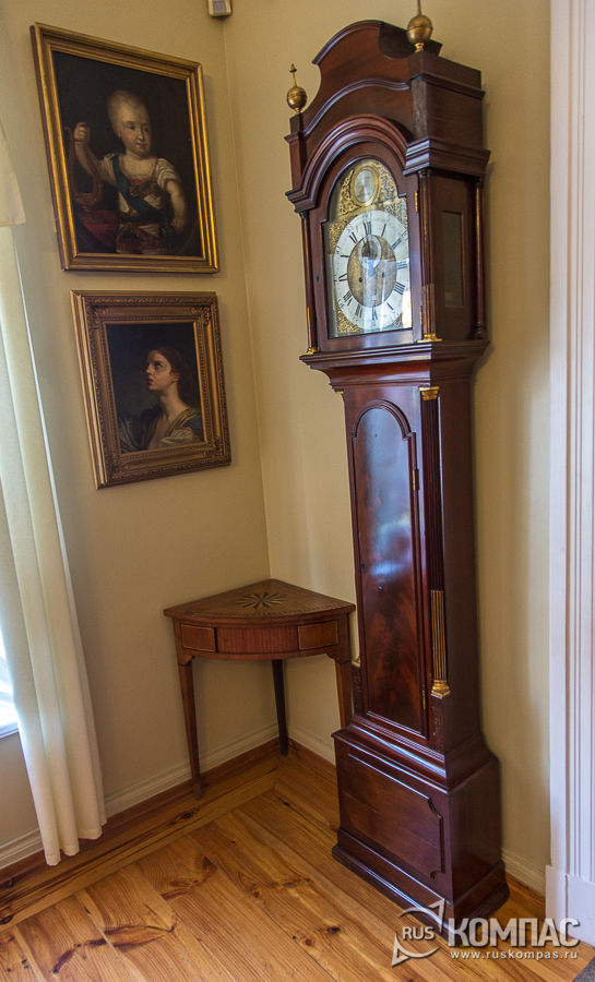 Из подлинных вещей в гостиной - каминные часы и заводная игрушка соловей в клетке.