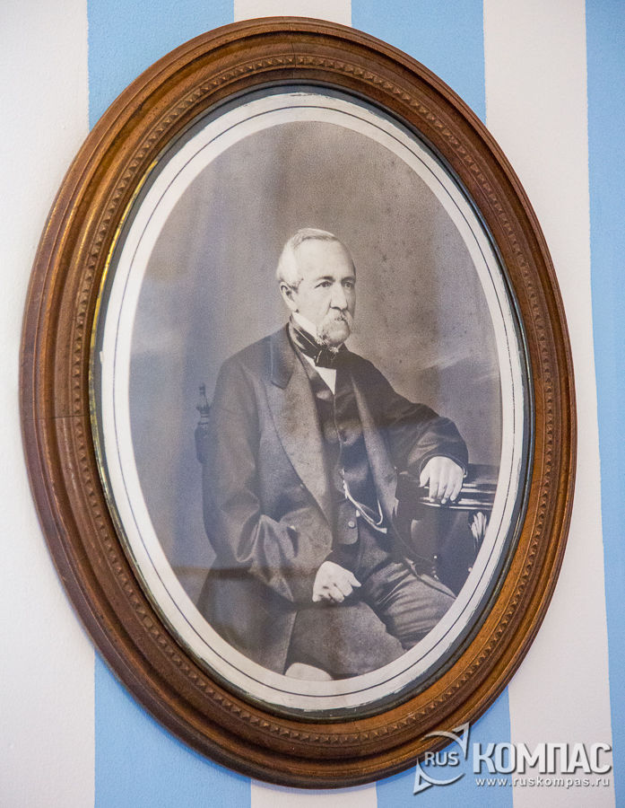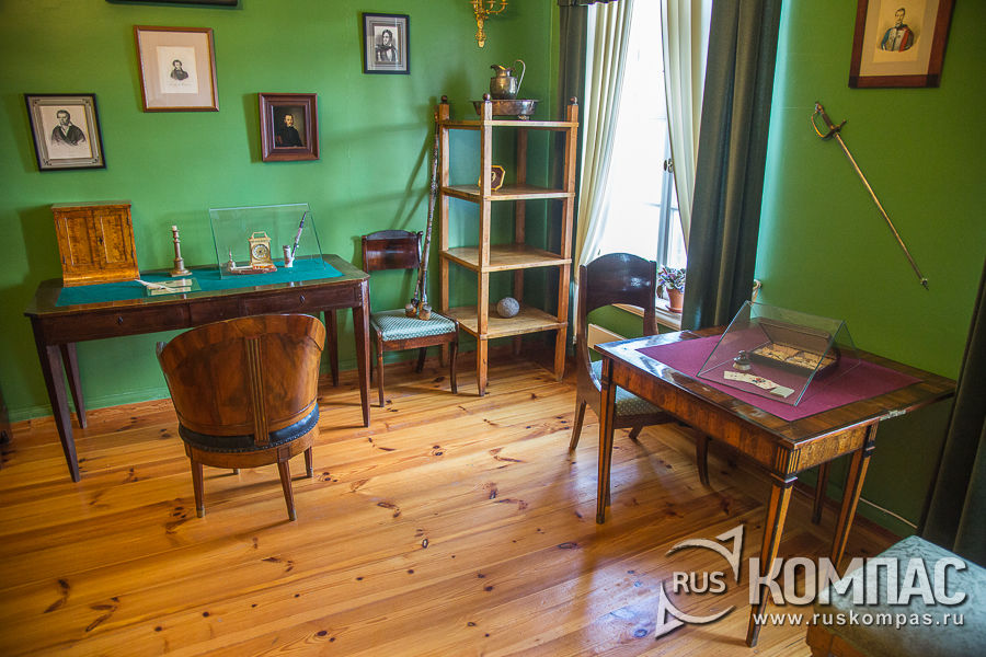 На время учебы Алексей эту комнату занимал Пушкин и, возможно, сидя в этом кресле-корытце, он начинает работу над "Борисом Годуновым". Рядом с портретом Вульфа-студента висит другой его портрет - в гусарском мундире. На момент написания этого портрета, Вульф участвует в походах в Турцию и Польшу. Разочаровавшись в военной службе, он уходит в отставку и до конца жизни занимается хозяйством, охотой, рыбалкой и чтением книг. На столе кабинета выставлена книга немецкого философа Иоганна Фихте "Назначение человека", принадлежавшая Вульфу. Позднее подобную книгу приобрел для себя и Пушкин. Над столом еще один портрет Вульфа. Таким Пушкин увидит друга в свой последний приезд в 1836 году, когда приезжает в Михайловское, чтобы похоронить свою мать в Святогорском монастыре. Через кабинет Алексея Вульфа мы проходим в комнату Евпраксии Николаевны Вульф. На стене комнаты висит предположительный портрет совсем юной хозяйки комнаты.