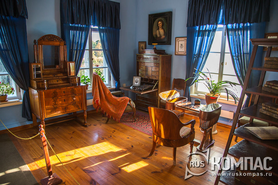 По вечерам к молодежи из соседней комнаты приходила хозяйка дома - строгая, своенравная по отношению к крепостным и своим детям. Она была дважды вдовой, и все заботы по хозяйству и воспитанию детей легли на её плечи. Черты хозяйки дома Пушкин отразил в образе старушки Лариной, хотя на тот момент Прасковье Александровне было 42 года. Она меж делом и досугом Открыла тайну, как супругом Единовластно управлять, И все тогда пошло на стать. Она езжала на работы, Солила на зиму грибы, Вела расходы, брила лбы, Ходила в баню по субботам, Служанок била осердясь - Все это мужа не спросясь. Из гостиной мы переходим в комнату хозяйки. В комнате много окон, через которые солнечный свет проникает в любой время дня. Вдоль стен стоят секретер, рабочее кресло и рядом столик для рукоделья. Прасковья Александровна с Пушкин могли часами оставаться в этой комнате и вести беседы на любые темы. Умная образованная женщина, увлекалась историй, философией, поэзией, и к Пушкину она относилась с большой заботой и лаской, в которых он нуждался и которую ценил.