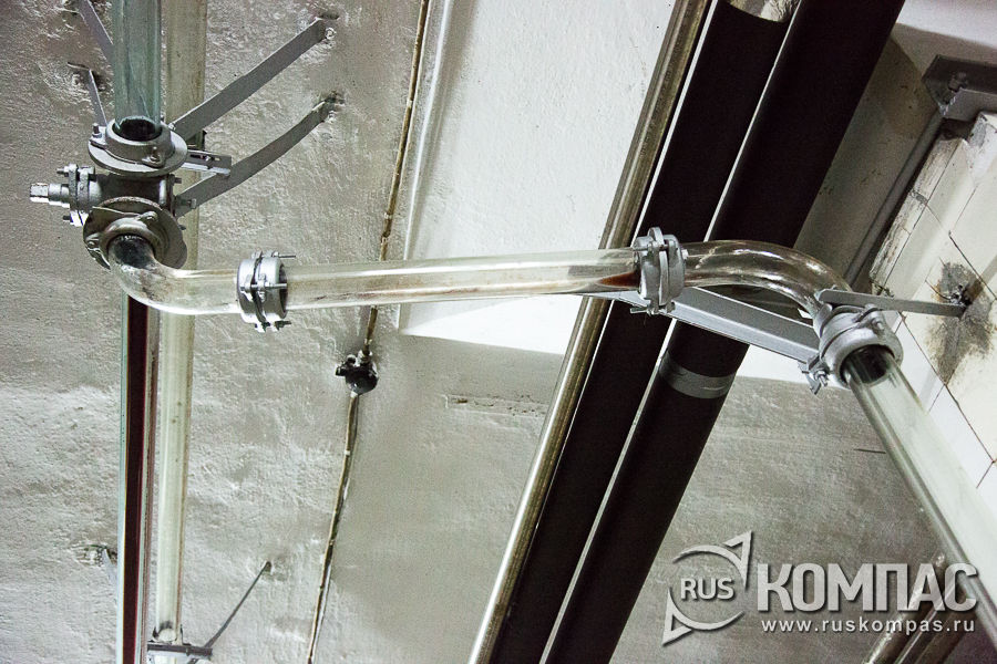 В первый год выдержки из вина выпадает огромное количество осадка - соли виных кислот, мертвые дрожжи, красящие и дубильные вещества. Осадок постепенно спрессовывается в винный камень, который закупоривает поры внутренних стенок тары и затрудняет дыхание вина. Поэтому на винзаводе делают переливку вина в чистую тару с помощью винопровода. В первый год обычно делают 4-5 переливок. С каждым годом выдержки осадка выпадает меньше и переливов, соответственно, тоже становится меньше. Для переливок используют винопровод, стеклянные трубы которого тянутся по стенам и потолку подвала, опоясывая и соединяя все цеха винзавода. В верхних царских подвалах сохранившийся винопровод из нержавейки, а здесь виден фрагмент старого винопровода 1956 года. Общая протяженность винопровода 24 км.
