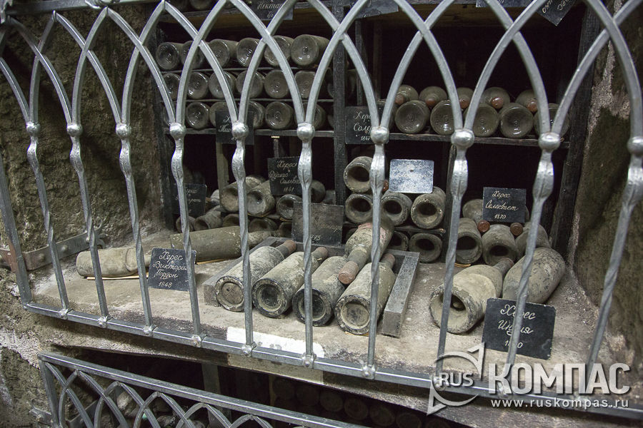 Обратите внимание, что на стенах соединительной галереи нет грибка. Стены здесь облицованы каменной плиткой, сохранившейся с царских времен, и покрыты побелкой, предохраняющей от образования грибка - где идет выдержка вина в дубовой таре грибка быть не должно. Из соединительной галереи мы идем в царское коллекционное отделение. Оно состоит из 1 большой и 8 малых галерей, расположенных на втором уровне подвалов. На третьем уровне - вход в самый большой подвал коллекционной галереи длиной 115 м и высотой в 2 этажа. Там хранится 500 тысяч бутылок с уникальными коллекционными винами. Вторая половина коллекции разложена по 8 малым галереям - 4 на втором уровне и 4 на третьем. Точно такие же галереи длиной 54 метра расположены за каждой дверью, которые мы видим, находясь на лестничных площадках подвала. Отсюда же идет соединительная галерея между царскими подвалами и цехом выдержки портвейнов. Это тоже коллекционное отделение (цех №10), но уже советской постройки. Во всех этих галереях на сегодняшний день хранится 1 "золотой миллион". Хотя самая большая коллекция из 2 млн. бутылок находится в Молдавии, по разнообразию и возрасту вин массандровская энотека занесена в книгу рекордов Гиннеса как самая уникальная в мире. В погребах "Массандры" хранится 800 марок вин, старейшее массандровское вино 1891 года урожая и старейшее вино мира Heres de la Frantera 1775 года урожая. В 1920 году семь бутылок этого уникального испанского вина сюда привезли из Воронцовских подвалов. В девяностых одну бутылку хереса продали за 50 тыс. долларов через аукцион Сотбис. Это была первая попытка госпредприятия "Массандра" участвовать в аукционе.
