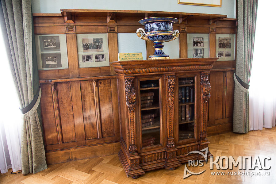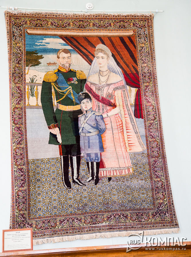 Над камином висит уникальный шерстяной ковер ручной работы - подарок персидского шаха на 300-летний юбилей дома Романовых. На нем вытканы портреты императора Николая II, его супруги Александры Федоровны и цесаревича Алексея.