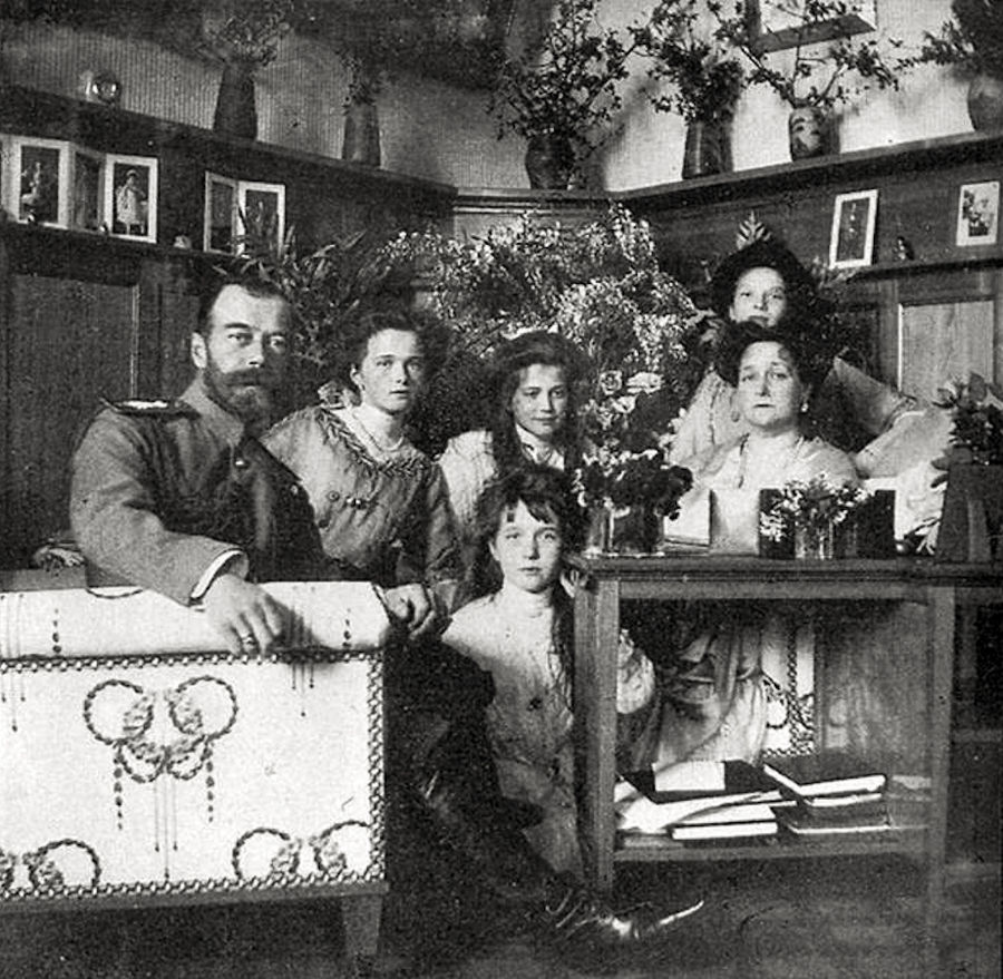 Рядом с опочивальней располагается будуар императрицы, где проходили семейные вечера. Через большие окна открывался прекрасный вид на местные красоты. Царская семья в будуаре императрицы, Ливадия 1911 г.