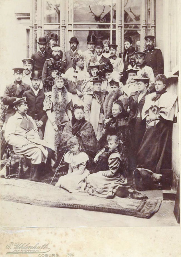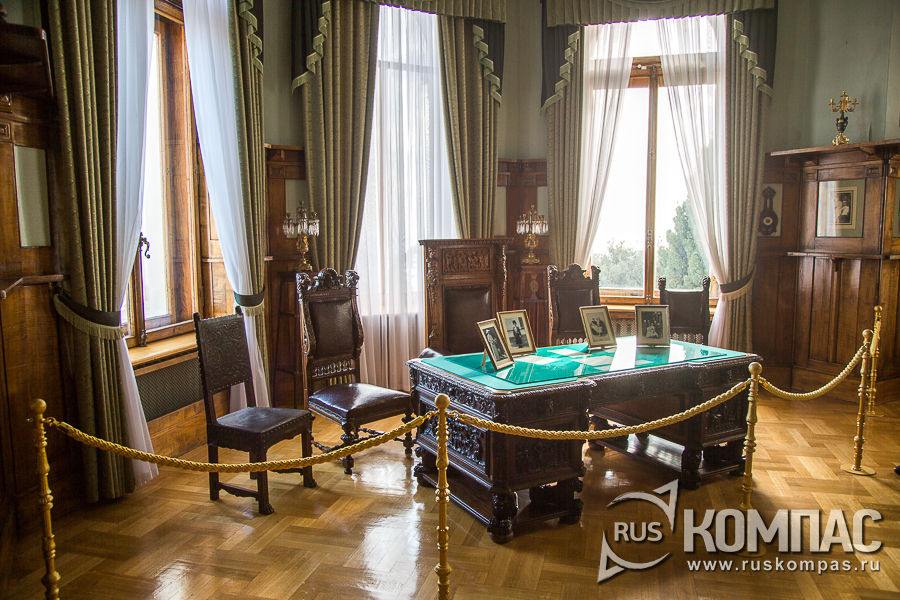 После революции ковер был утерян, и долгие годы о его судьбе не было ничего известно. Лишь в начале 1980-х годов стараниями группы энтузиастов, в числе которых был известный советский писатель Юлиан Семенов, ковер был обнаружен в Берлине. С аукциона за 30 тысяч долларов ковер приобрел коллекционер и меценат барон Эдуард Александрович фон Фальц-Фейн. И когда Эдуард Александрович в 1993 году был в Ливадии, он подарил реликвию Ливадийскому дворцу. Через верхний кабинет, мы проходим в кабинет императрицы, расположенный в восточной части дворца. Из него можно спуститься в парк по внешней лестнице, искусно замаскированной легкой аркадой. Кабинет отделан светлым деревянными панелями, что делает комнату наряднее, просторнее. Небольшой камин как бы заключен в рамку из этажерки ясеневого дерева. В верхнюю часть этажерки над камином вмонтировано зеркало в стиле модерн. Одним из увлечений царской семьи была фотография. В зале экспонируются копии любительских фотографий из царских альбомов, а также официальные снимки, сделанные в разные годы. На этом фото цесаревич Николай Александрович и принцесса Гессен-Дармштадская Алиса в окружении многочисленных родственников великих князей и княгинь, принцев и принцесс, герцогов и герцогинь, а также кайзера Германии и бабушки Алисы английской королевы Виктории. Снимок сделан 8 (21) апреля 1894 года в городе Кобург лучшим местным фотографом. На нем запечетлен день помолвки будущих императора и императрицы.