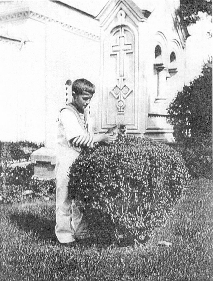 Цесаревич Алексей играет с щенком рядом со звонницей. Октябрь 1913 г.