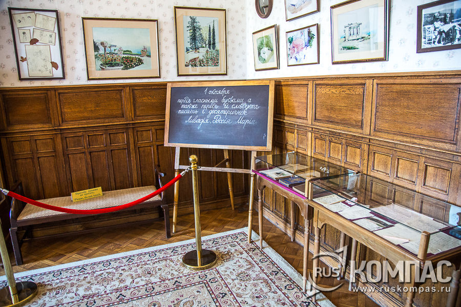Из всех жилых комнат дворца скромнее всего были оформлены детские. Не из экономии - это было элементом воспитания. Обстановка классной комнаты великих княжон не сохранилась: мебель расставлена произвольно, в витрине лежат учебники начала XX столетия.
