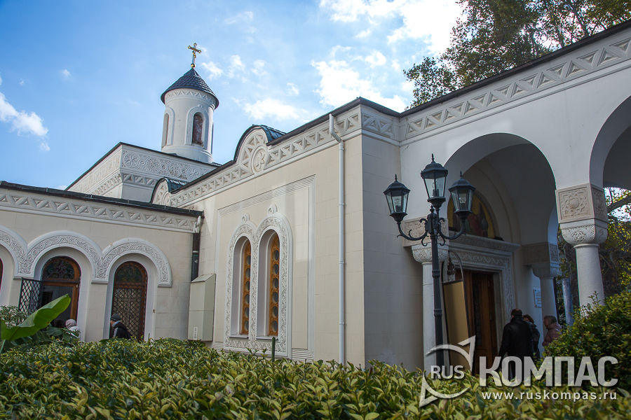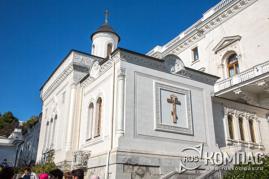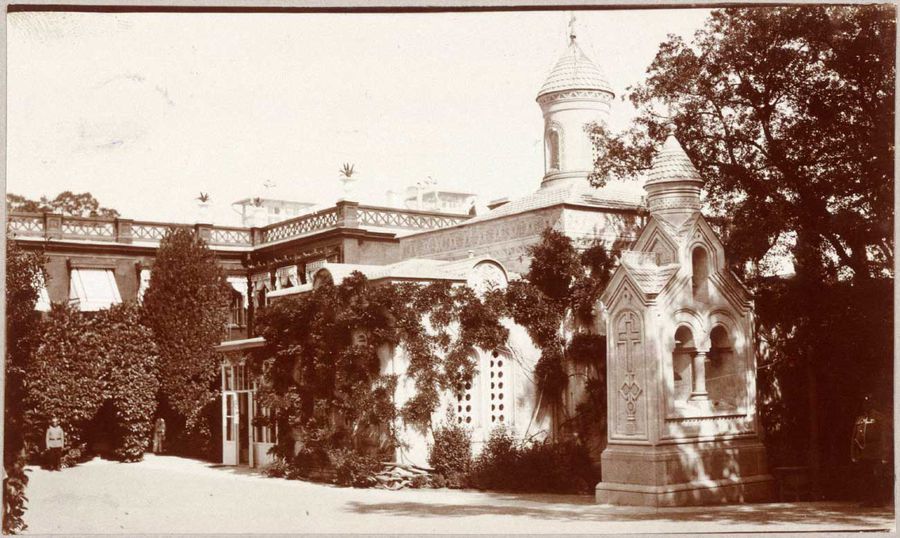 Из большого Ливадийского дворца мы выходим к домовой Крестовоздвиженской церкви - архитектурному шедевру Монигетти, лучше всего сохранившемуся при позднейших перестройках. По сути, церковь является частью дворца, и при перестройке Николай Петрович Краснов максимально бережно отнесся к творению своего предшественника. Он увеличивает притвор церкви примерно вдвое, что дало возможность устроить новый вход в храм, и соединяет его открытой галереей с аркой ворот Итальянского дворика. Дворцовая Крестовоздвиженская церковь по проекту Монигетти, 1912 г.