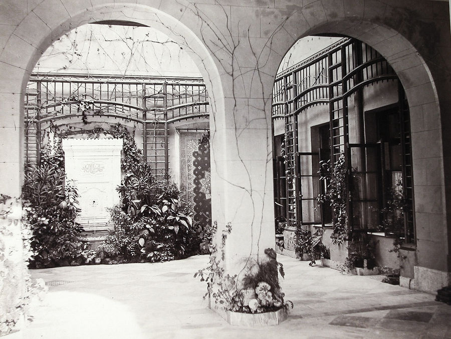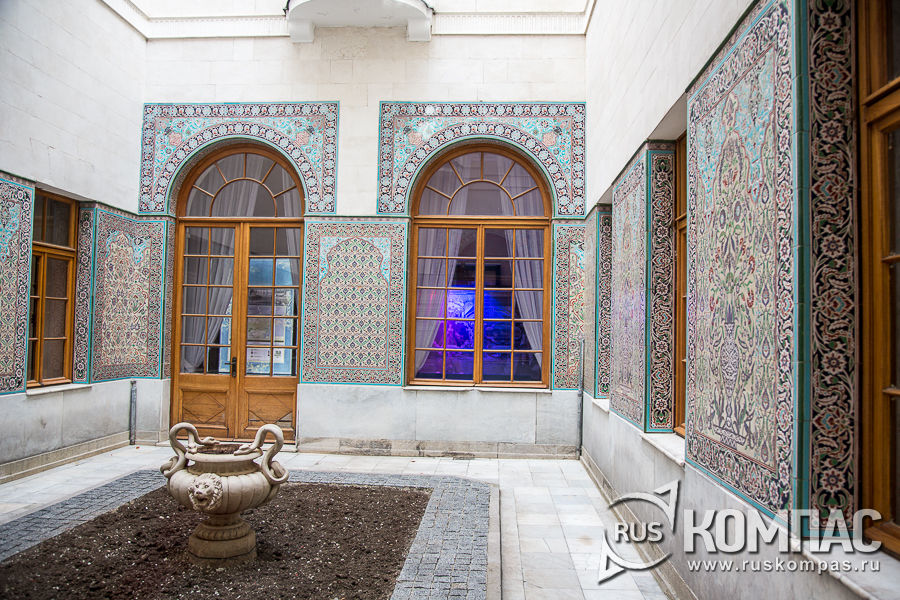 Начало. Крым: Большой Ливадийский дворец (часть I) Из Итальянского дворика возвращаемся во дворец, проходим по коридору и через окно первого этажа любуемся атриумом - световым колодцем, благодаря которому дневной свет проникает в те помещения, для которых окна во дворик являются единственным источником естественного освещения. Атриумы были и в прежнем дворце по проекту Монигетти. Краснов ввел в конструкцию нового дворца целых три световые дворики, что позволило максимально использовать солнечное освещение для жилых комнат. Стены первого этажа, ограничивающие уютное патио, в центре которого установлен небольшой фонтан, облицованы многоцветной майоликой с растительным орнаментом. Дворик называют Арабским.