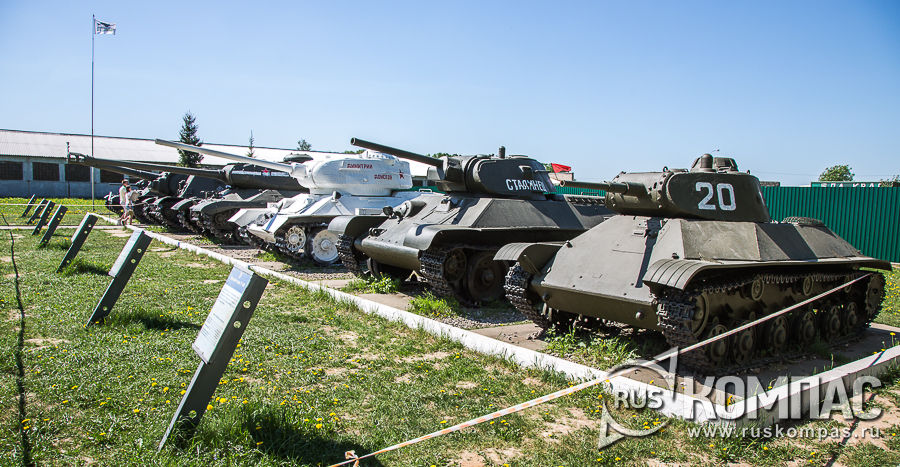 Небольшая часть экспонатов музея военной техники в Кубинке размещена под открытым небом. Непосредственно за входными воротами на небольшой площадке стоят танки стран-победительниц во Второй мировой войне.