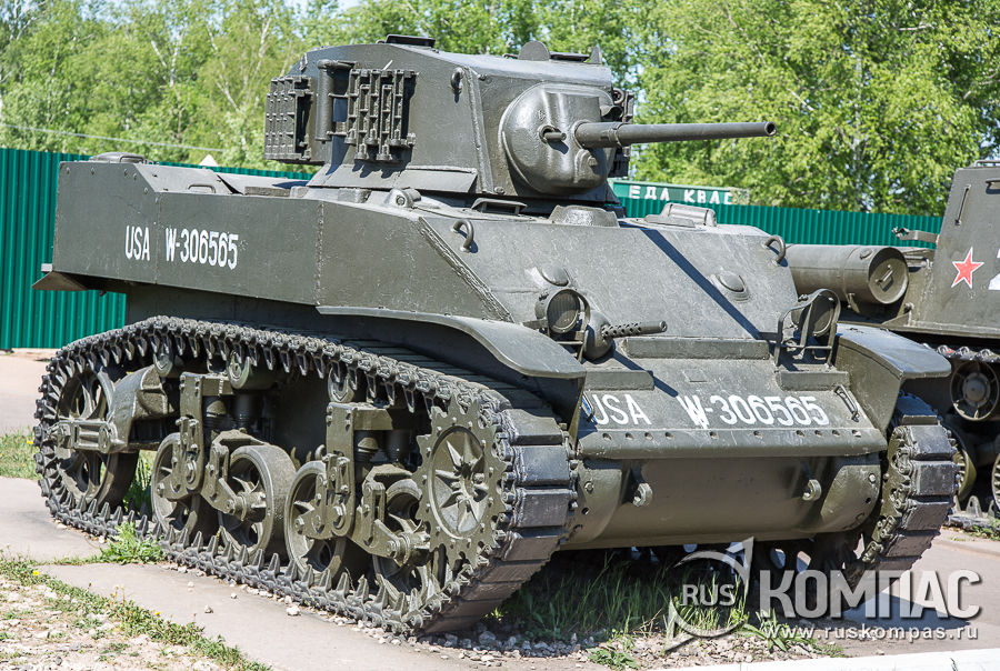 Лёгкий танк М5А1 "Stuart" ("Стюарт"), произведенный фирмой Cadillac, назван в честь генерала Гражданской войны в США Джеба Стюарта. Главное отличие от предыдущей модели M3A1 - наличие двух карбюраторных двигателей вместо одного авиационного. В СССР по ленд-лизу было поставлено всего 5 таких танков. Неподалеку от танков-победителей на небольшой площади установлена памятная стела на братской могиле четырех бойцов 119 танкового полка прорыва, погибших под деревней Гнездилово Спас-Деменского района Калужской области 8 августа 1943 года во время Смоленской операции. Об этом дне в сводках написано следующее: "8 августа 1943 г. танки полка совместно с пехотой 22-й гв.сд в упорном бою овладели хутором Безымянный, д. Веселуха и к 10.00 вышли на северные скаты высоты 233,3. В этом бою танками уничтожено: 4 пулеметных дота, 8 пушек, до батальона пехоты противника, 12 пулеметов, 5 автомашин, 6 мотоциклов". Останки бойцов найдены поисковиками и перезахоронены на территории музея. Когда стоишь рядом с памятником, слышишь звон, напоминающий колокольный - это от порывов ветра ударяются друг о друга подвешенные к стеле макеты танковых гильз.