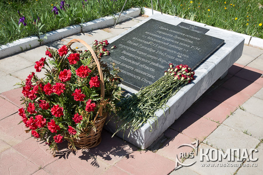 Рядом со стелой - мраморная плита с выбитым на ней текстом: "Здесь покоятся останки механика-водителя танка Т-34 "Московский пионер" сержанта Сергея Лукоянова, 215 танковый полк. Погиб 7 декабря 1942 года при переправе через озеро Боз-Лазава Великолукского района Псковской области".