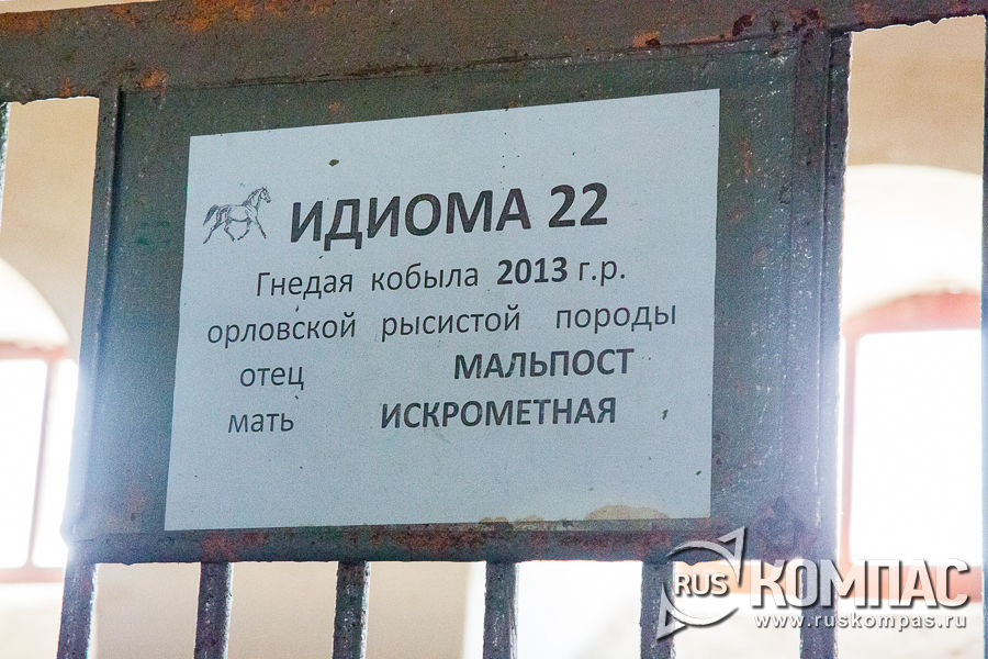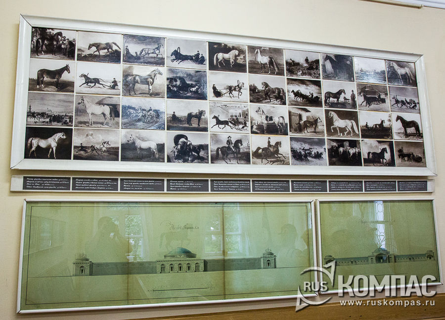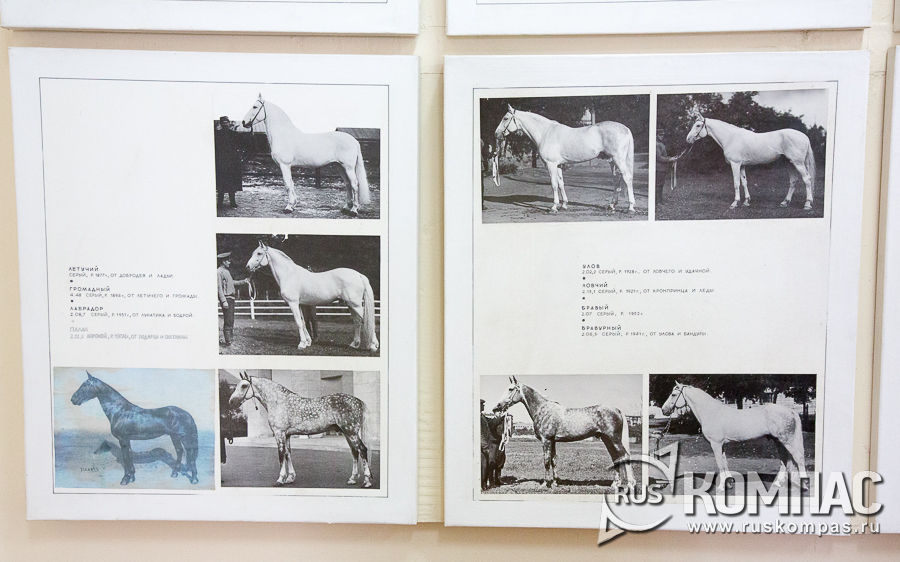 Орловский рысак - крупная лошадь с длинными сухими конечностями, длинной мордой, ростом в холке 160 см и с вытянутым в длину телом, как у Сметанки. Но никому не передалась мутация арабского жеребца - 19 пара ребер. Рысаки бывают 4 мастей. Самая распространенная, доминирующая масть - серая. Вероятно, потому что Граф Орлов любил серых рысаков за их нарядность. Но серой лошадь остается 3-4 года, постепенно становясь пятнистой - серой в яблоках, а к 8-10 годам - белая-седая. Остальные масти - гнедая, вороная и рыжие - сохраняются у рысаков на всю жизнь. В последнем зале стены увешаны портретами тренеров, наездников, работавших на Хреновском конезаводе в разные времена.