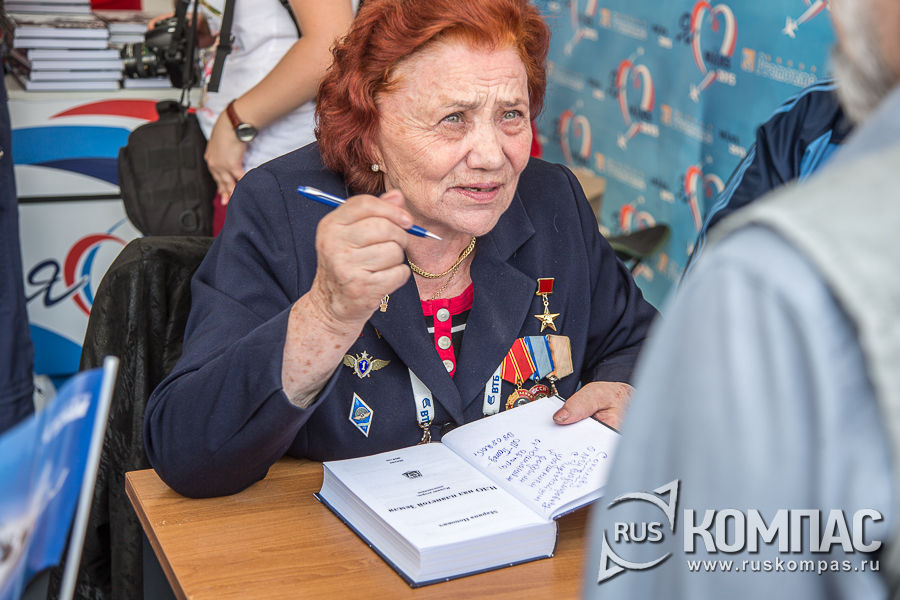 Марина Лаврентьевна Попович подписывает свою книгу "НЛО над планетой Земля". Летчик испытатель первого класса, инженер-полковник авиации Марина Лаврентьевна летает с 1947 года. Ей первой из женщин доверили право испытывать реактивные самолеты. Сейчас ей 84 года, и последний раз она поднималась в небо в составе экипажа в 2013 году. Очень советую почитать об этой удивительной женщине.