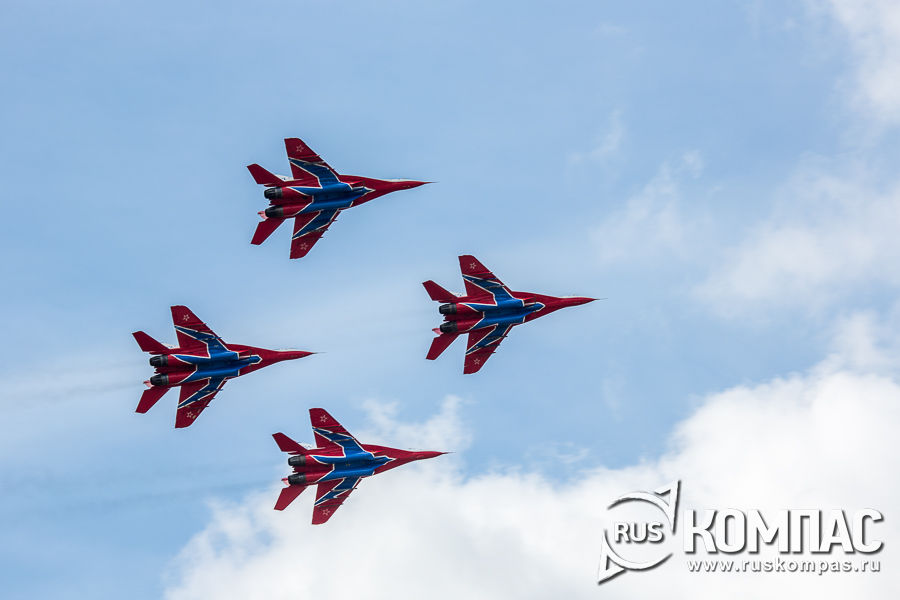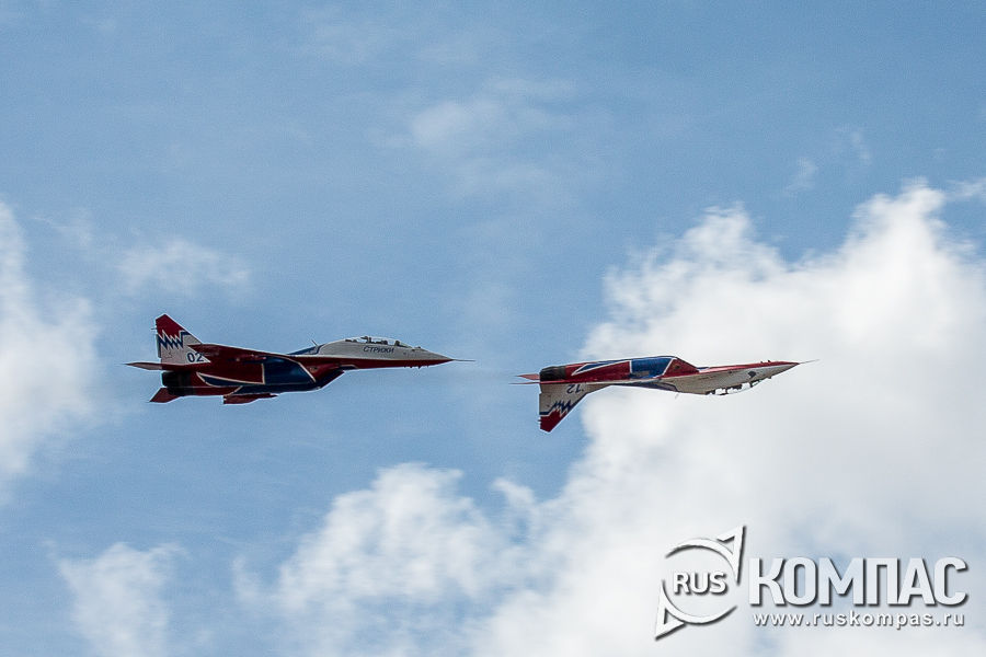 Первыми из пилотажных групп выступали "Стрижи" на истребителях МиГ-29. Авиационная группа высшего пилотажа ВВС РФ была сформирована в 1991 году на базе 234-го гвардейского Проскуровского авиаполка из лучших лётчиков подмосковной авиабазы Кубинка. Сказать, что это было очень красиво - значит ничего не сказать.