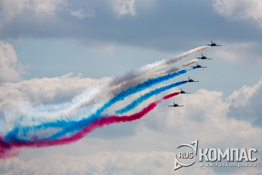 Следом российским триколором небо раскрасили Л-39 пилотажной группы "Русь" ВВС РФ. "Русь" - авиационная группа высшего пилотажа, созданная на базе Вяземского учебного авиационного центра ДОСААФ в 1987 году.