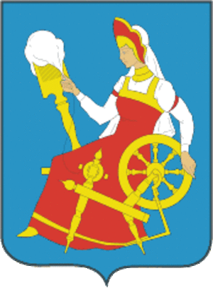 В настоящее время герб выглядит совершенно по-другому. Основной фон герба классической формы голубого цвета. На нем изображена девушка-пряха. Она одета в красный сарафан и красный кокошник. В руках у нее золотая прялка. Левой рукой пряха вращает колесо, а правой тянет серебряную кудель.
