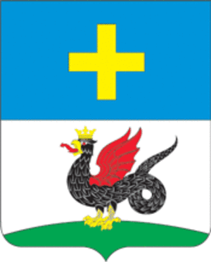 Герб представляет собой щит, который разделен горизонтальной чертой. В нижней его части изображен дракон, извергающий пламя, с красными крыльями и золотой короной на голове. В верхней части герба - золотой крест.