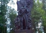 Монумент представляет собой фигуру русского солдата, идущего в атаку с винтовкой наперевес. Позади него развивается знамя Псковского полка.