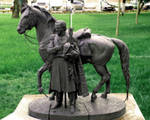 Скульптурная композиция, на которой Атаман изображён не в пылу битвы, а после победы над иноземным захватчиком. Сойдя с коня, Атаман, сняв кивер, возложа руку на сердце, с благодарностью и скорбью вспоминает своих погибших соратников, положивших «жи