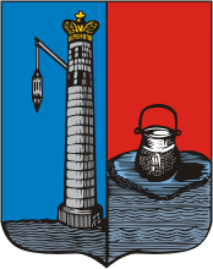 Герб поделен на две части вертикальной линией. В первой располагается рисунок башни серебряного цвета с маяком.