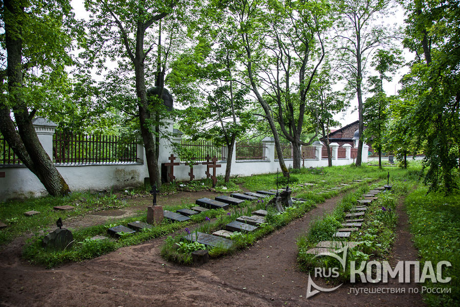 Братское кладбище примыкает к северной линии наружного каре - четырехугольника монастырских корпусов, окружающих собор Преображения Господня. Оно обозначено еще планах середины XVIII в., но одну из уничтоженных ныне могил (осколки плиты в музее) предание относило к XIV в.