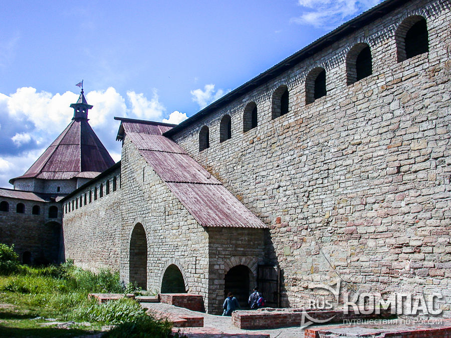 Общая протяженность стен каменного Орешка — 740 метров, высота — 12 метров, толщина кладки у подошвы — 4,5 метра. По верху стен был устроен крытый боевой ход, который соединял все башни и давал возможность защитникам быстро перемещаться в самые опасные места. На боевой ход можно было подняться по трем каменным лестницам, расположенным в разных концах крепости.