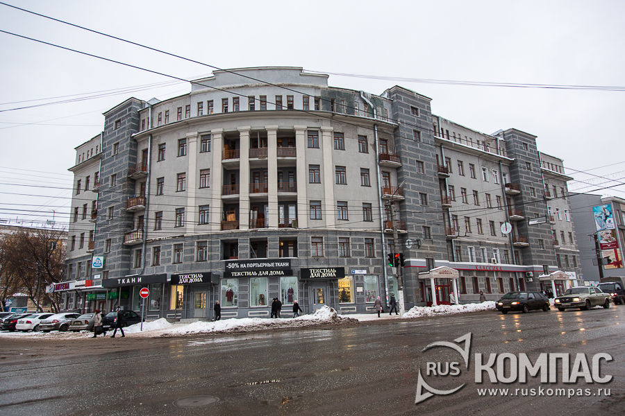 Шестиэтажный жилой дом архитектора Чарушина построен в 1939 г. для работников Кировского управления НКВД. Интересная деталь - Дом чекистов построен углом больше 45 градусов, так как в этом месте улица Герцена из-за оврага Засора идёт немного наискосок. Чарушин использовал эту особенность городской планировки, чтобы "развернуть" здание.