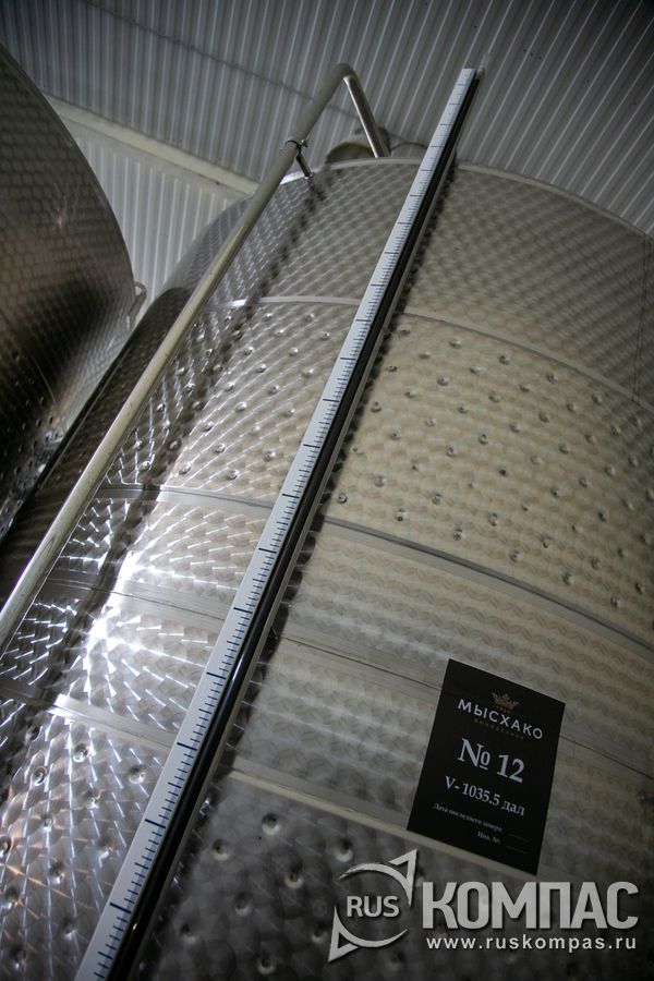 Добавляют для брожения определенный сорт винных дрожжей. Дрожжи поедают сахар, выделяется спирт, углекислый газ. И за всеми процессами следит автоматика. Первичное брожение длится 3-4 недели. Линейка сбоку - уровень вина в резервуаре.
