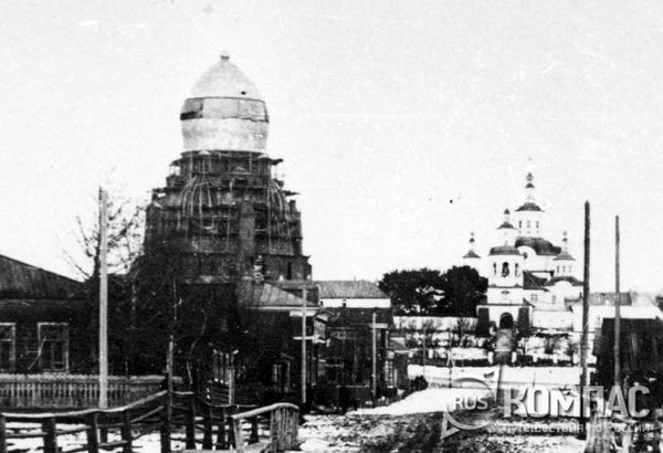 Идем дальше. С северо-восточной стороны города возвышается холм, разделенный на два участка, которые раньше называли Красная и Ивановская (Сокольничья) горы. На Ивановской (Сокольничьей) горе находился соколиный двор баскака Багуя, который, опасаясь расправы устюжан, принял крещение с именем Иоанна, женился на своей наложнице Марии и заложил в 1262 году монастырь - Иоанно-Предтеченский. Изначально монастырь был мужским, но после перевода в него инокинь из Спасо - Преображенского монастыря, обращен в женский. Со временем монастырь разросся. В дополнение к храмам построили больницу и богадельню, приют для девочек-сирот, странноприимный дом для приходящих издалека богомольцев, хлебопекарню. Монахини занимались золотошвейным и белошвейным ремеслами. 25 мая 1909 года был заложен главный храм монастыря. В плане он представлял собой симметричный крест со шлемовидным куполом. В средней части купола имелась широкая полоса, не покрытая железом, предположительно символизируя усекновение головы Иоанна Предтечи. Но, возможно, купол просто не успели полностью покрыть железом, так как в 1919 году все строения монастыря перешли Советской власти. Вот так выглядел строящийся храм: