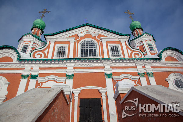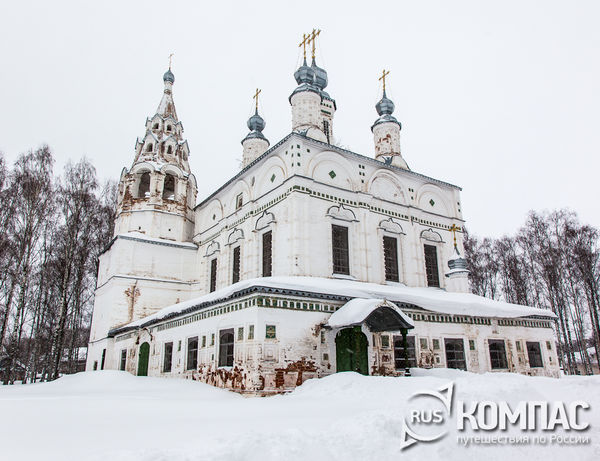 Чуть поодаль на берегу Сухоны выстроены Никольская, Вознесенская церкви и совсем вдалеке церковь Симеона Столпника. Церковь Симеона Столпника - единственная из сохранившихся в Устюге церквей в силе западноевропейского барокко: