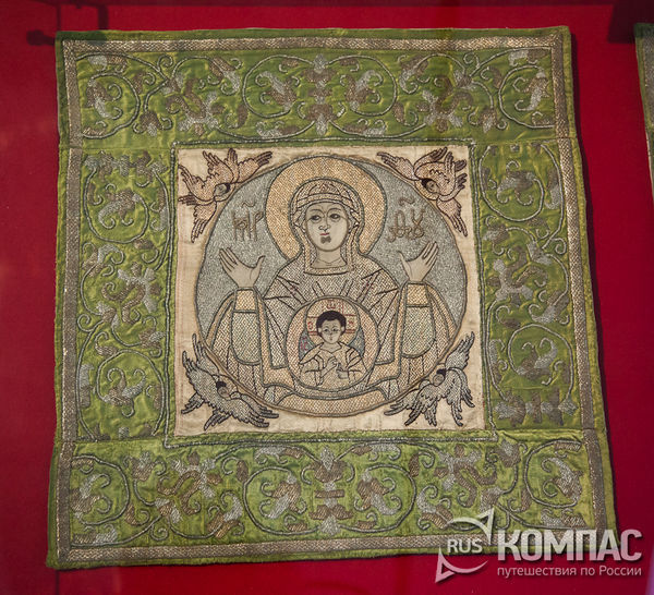 Здесь же выставлены для осмотра деревянные царские ворота, украшенные орнаментальной резьбой, и скульптурное изображение пиеты (оплакивания Христа). Вырезанное из дерева изображение Богородицы с Христом - редкое для православия явление. Деревянные скульптуры Христа и святых можно увидеть разве что в Перми, но об этом позже.