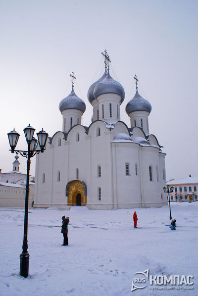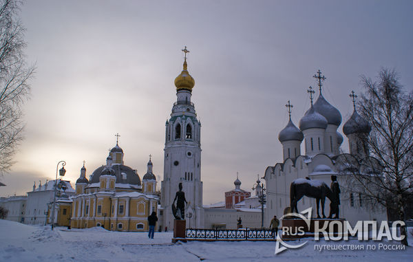 Знакомство с зимним городом стоит начать с Соборной горки - небольшого возвышенного участка, расположенного на правом берегу реки Вологды. В эпоху Ивана Грозного здесь велось грандиозное строительство: в те времена расположение города способствовало активной торговле буквально со всеми русские и некоторыми зарубежными городами, что стало одной из причин, по которой царь решил сделать Вологду своей зимней резиденцией и центром Опричнины. На строительство Вологодского кремля были выделены средства из казны. Первым каменным зданием города стал Софийский собор или, как его раньше называли, София Вологодская - одна из главных святынь русского Севера, храм, воздвигнутый по образу и подобию Успенского собора в Москве.
