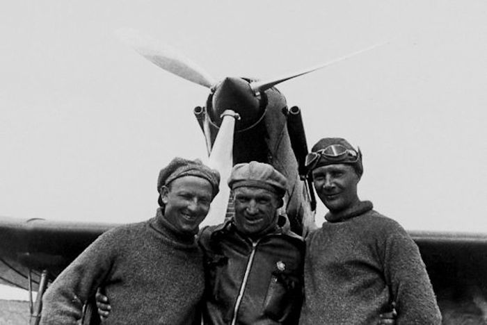 Экипаж рекордного перелета на АНТ- 25 А.В. Беляков, В.П. Чкалов, Г.Ф. Байдуков после приземления.